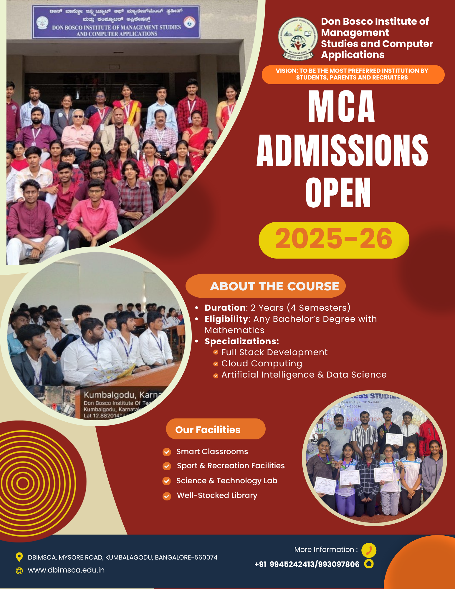 Recognized as one of the best degree colleges in Bangalore, Don Bosco Institute of Management Studies & Computer Applications (DBIMSCA) was established in 2008. It offers various undergraduate courses, including B.Com., BBA, and BCA, integrated with an Entrepreneurship Development Program (EDP) for aspiring entrepreneurs. DBIMSCA continues to be one of the best degree colleges in Bangalore for those looking to master their own destiny. Programs